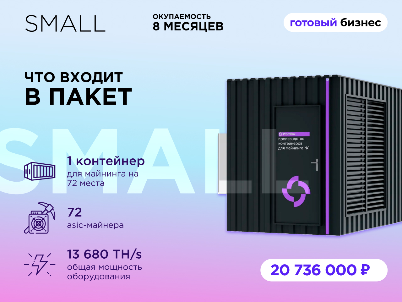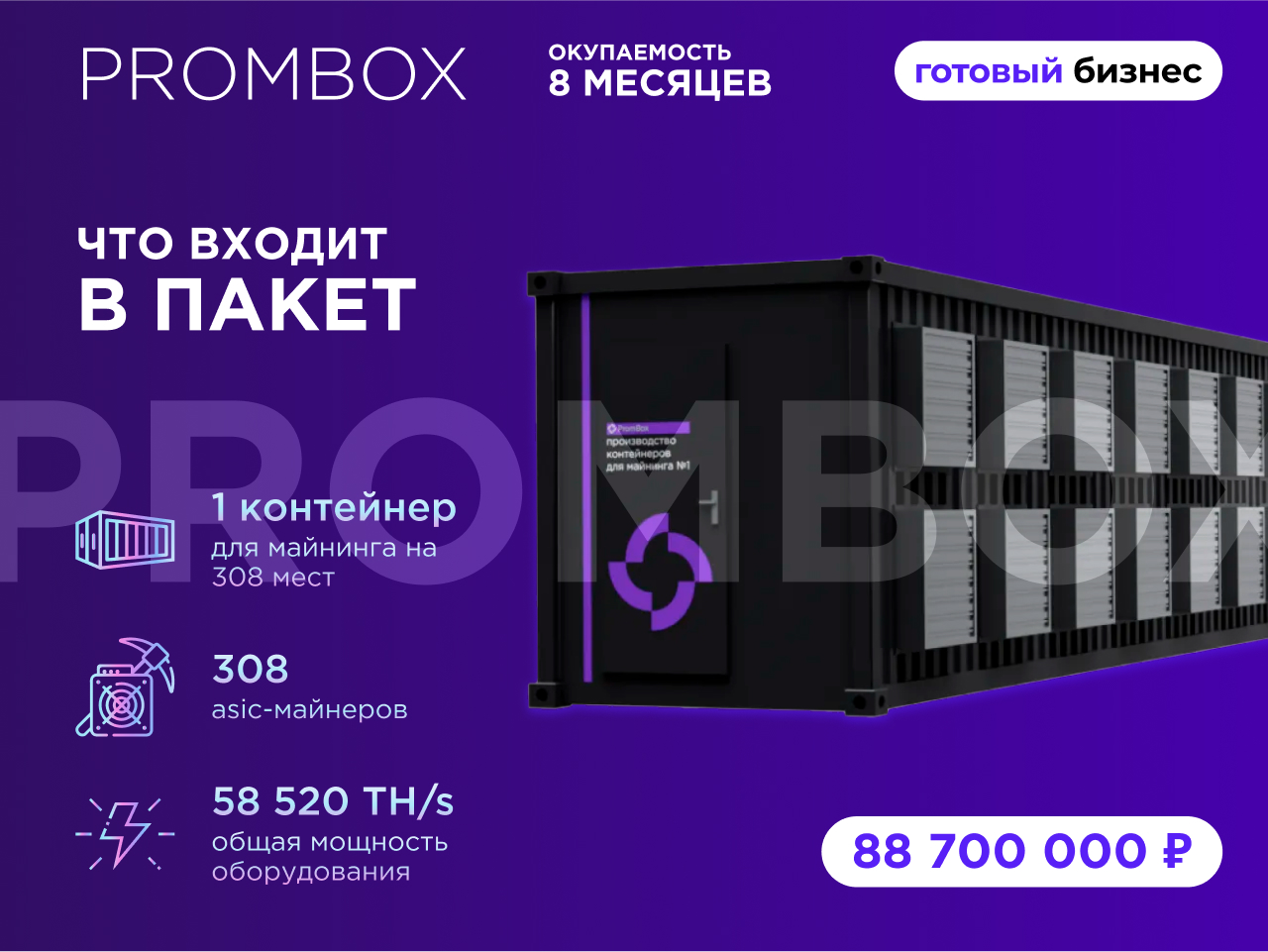 Один контейнер для майнинга на 308 мест;308 asic-майнеров;