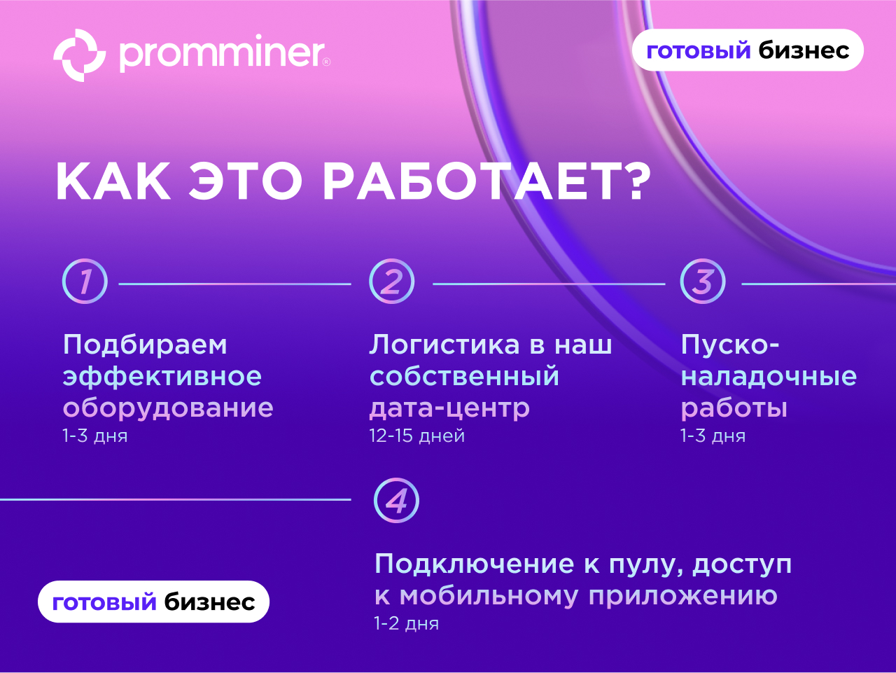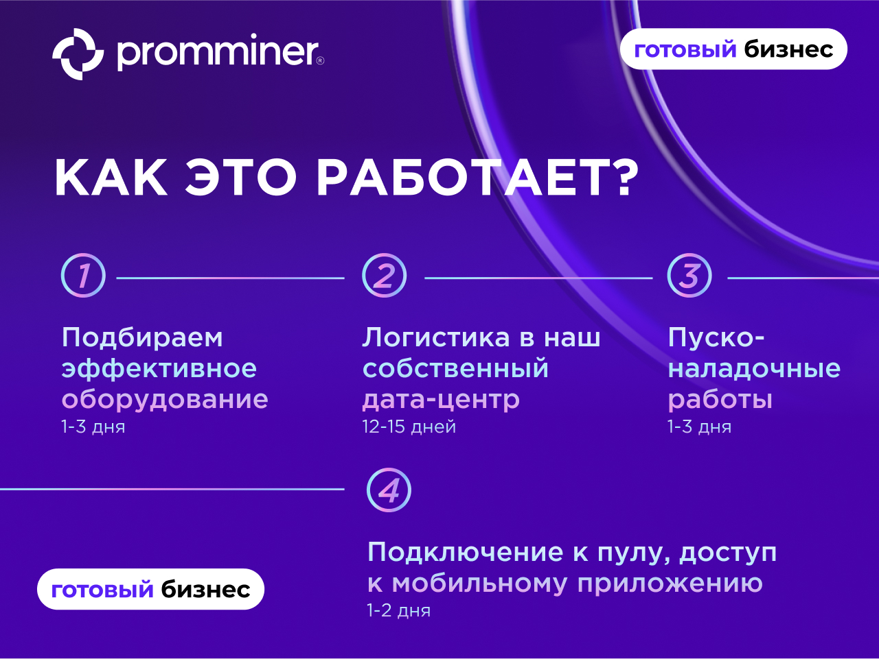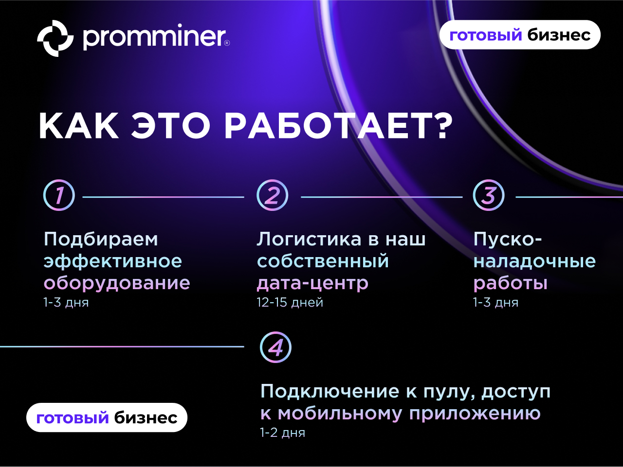 Компания Promminer возьмет на себя все сложности и операционные процессы.ПРИБЛИЗИТЕЛЬНЫЙ СРОК РЕАЛИЗАЦИИ БИЗНЕСА “ПОД КЛЮЧ” — ОТ 15 ДНЕЙ.