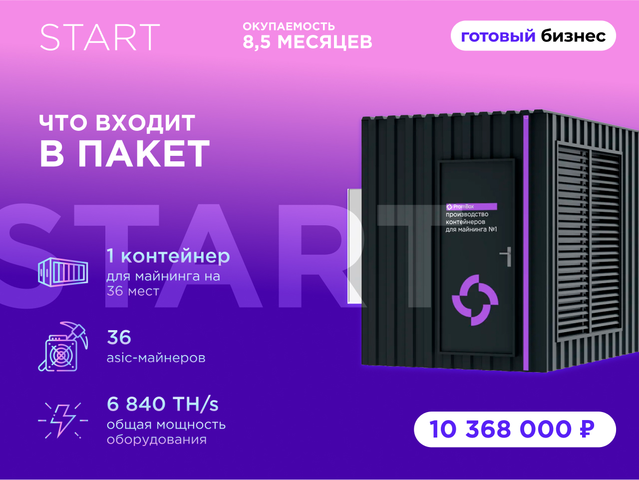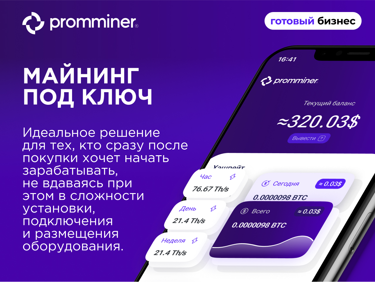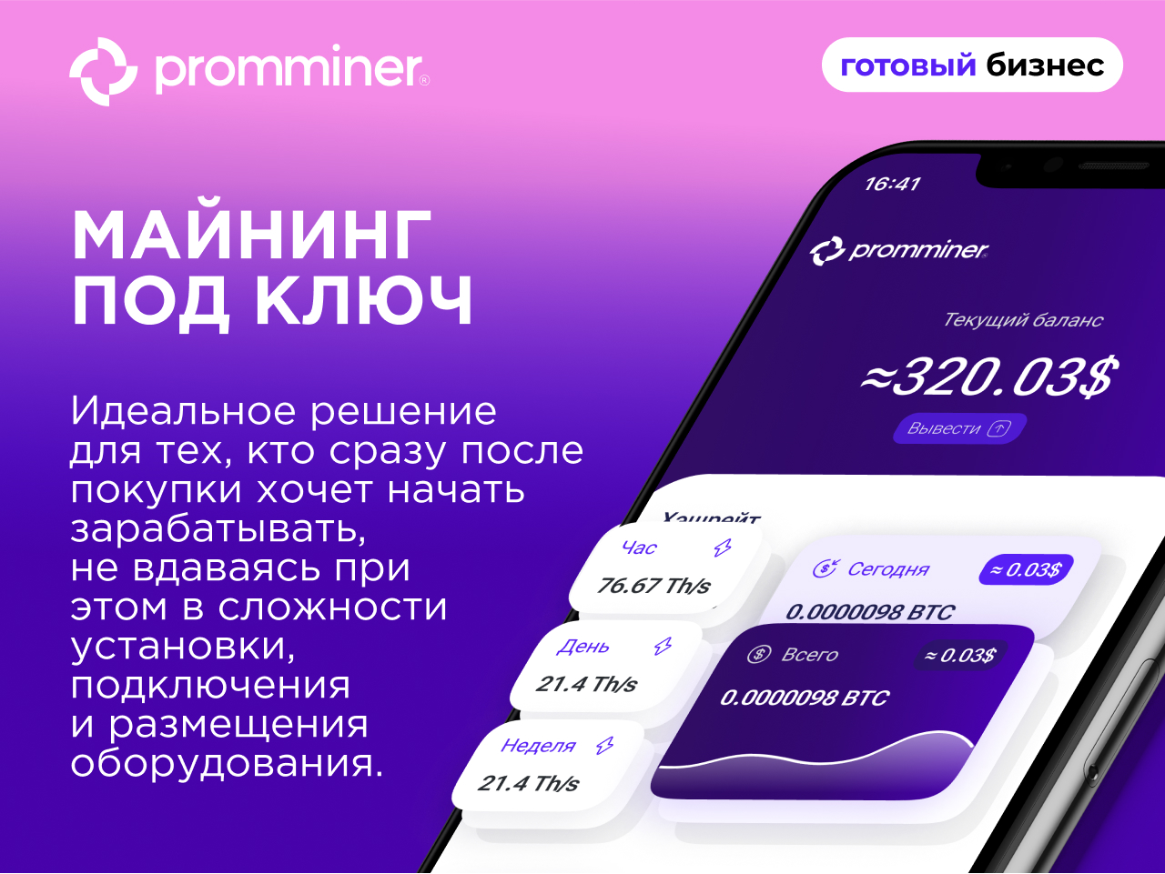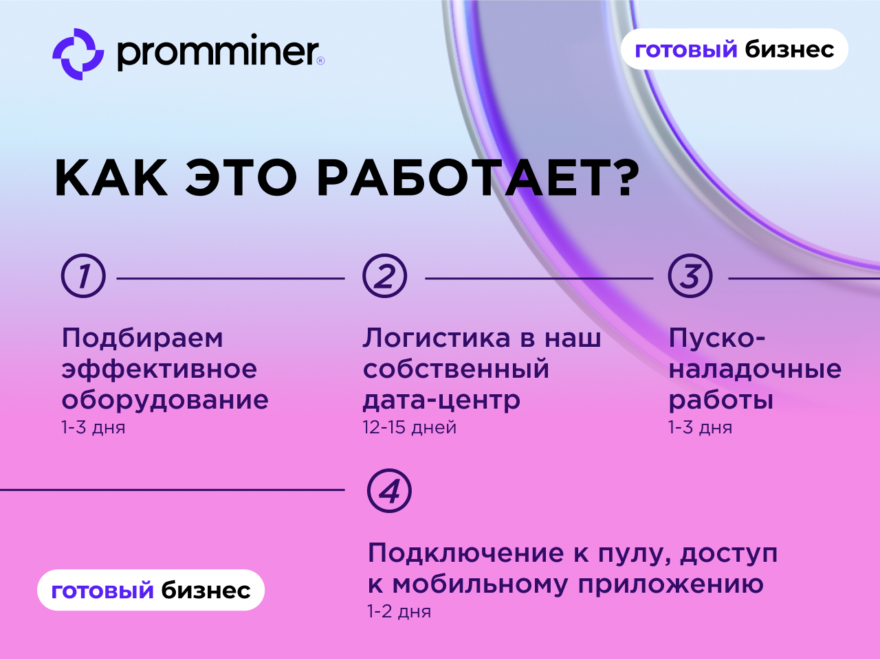 Компания Promminer возьмет на себя все сложности и операционные процессы.ПРИБЛИЗИТЕЛЬНЫЙ СРОК РЕАЛИЗАЦИИ БИЗНЕСА “ПОД КЛЮЧ” — ОТ 15 ДНЕЙ.